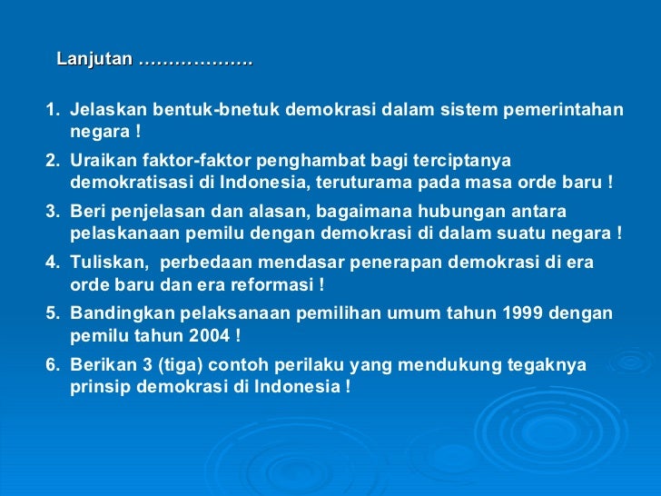 Proses pembangunan nasional yang berlangsung dewasa ini sedang mengalami pergeseran dari bingkai sistem otoriter ke sistem demokrasi.